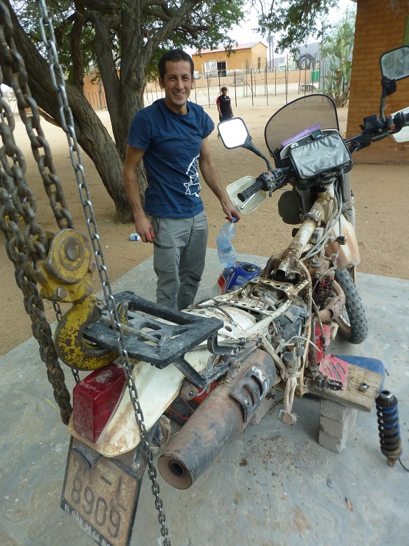 Après une discussion houleuse avec Mete dont je me serai bien passé et la belle rencontre de Xabi, un motard espagnol avec qui le contact humoristique passe direct, je mets le cap vers les plus hautes dunes de Namibie, direction Sesriem. Seul face à la montagne qui crépite d'éclairs, la pluie se met à tomber. Le vent soulève des bourrasques de poussière qui me font pester. Inutile d'essayer d'avancer avec ce vent qui me fait reculer: je pose mon beks au milieu de la plaine, trouve un vieux paquet d'biscuits qu'il me reste d'Angola au fond d'une sacoche, me marre un coup, et m'assied à la mauritanienne, le cul sur les talons. Attendre que ça s'calme... Je repars assez vite, dépassé aussitôt par une voiture qui me lance un "Hey man? You wanna cold drink?..." Hahaha! Quelques rires contagieux puis le vent vire au nord et finit par me pousser. Passé la petite bute, une autre plaine, un autre décor surprenant m'attend. La piste chahute. Rafales de dos, de côté, de face, avec sable, sans sable. Mon vélo dérive... J'arrive en pleine tempête de sable au campement du parc, tentant d'abriter mon vélo de ce vent violent. Impossible de planter la tente dans ces conditions, mais au coucher du soleil, le climat s'apaise net. Cherchant mon emplacement-camping quelque part le long de la piste de sable, une surprise de taille m'attend: je rencontre Claudine, un cycliste liégeoise des premiers coups d'pédales de Roule ta bosse. Venue en Namibie en voyage organisé, je passe la soirée avec son groupe autour d'un délicieux poisson, invité par leur guide Nive. Et le lendemain, heureux hasard, alors que le parc est interdit aux vélos, je me joins également à eux pour une balade touristique dans ce plus vieux désert du monde. Sossusvlei et la cime des dunes qui ondulent, à 60 kilomètres de là.