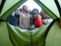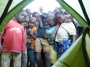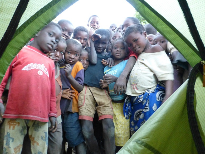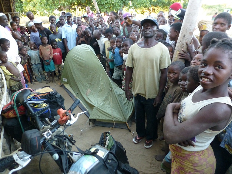 Ce matin, je joue à mon jeu favori: le "dire bonjour". "Bom dia...", "Como está ?", "Amigooooooo !" Dans cette sorte de course cycliste que j'intègre dès les premiers coups d'pédales, tous me répondent sans exception. Au Mozambique, les sourires éclatent, naturels, plus enchanteurs qu'ailleurs... D'émotions, j'en ai parfois les larmes aux yeux. Avec cette "lumière matinale cadeau" qui caressent les peaux, je m'émerveille encore plus des visages, de ce métissage que je n'ai vu qu'ici, marqué non dans la couleur de peau, mais dans les traits, les formes, les corps longilignes. Tous les matins, la campagne mozambicaine affiche son maximum : les épis de maïs qui sèchent au soleil débordent des toits de chaume, les vélos roulent lentement chargés à l'excès... et que dire des têtes des femmes, en plein exercice d'équilibre, tout sourire, surchargées elles aussi de fagots d'herbes séchées, de bois, de bassines remplies ou de seaux d'eau bien pesants. Chacun vaque à ses occupations quotidiennes, précises, liens sociaux, laissant les plaintes aux nantis chez qui tout est facile, gaspillé, où personne ne sera plus jamais content. Dès l'aube, le moindre détail est prétexte à bonne humeur... Sur un petit sentier ombragé, je déguste mes 3 petites miches de pain frais et quelques beignets à base de farine de haricots. Me voyant, une vieille dame hésite tout d'abord à s'engager, puis elle vient me parler, décontractée, rigolarde, me proposant le cul de sa fille, juste pour moi, moulé dans son joli pagne. Éclats de rire... Au loin, je l'entends déjà raconter l'histoire du blanc en train de manger, assis au pied de son vélo. Quand je reprends la route, un petit bonhomme et son vélo 2 fois trop grand pour lui déboule sur la route, gravissant la bute à la force de ses petits mollets et poignets. Regard furtif, quelques tours de roues devant moi, et il redescend illico par le sentier de la case voisine, un rien en panique. Il y a aussi ce gros motard, avec son casque "taille small" duquel ressortent ses pommettes surcompressées, à la limite de l'explosion. Avec toutes ces montées qui s'accumulent, mes jambes abdiquent pour aujourd'hui. Je tombe directement sur un chef de village dont la maison se situe en bord de route, à côté du petit marché. Ouh, pas vraiment calme ça, mais bon... je me résous à dresser la tente où je peux, entouré par des dizaines de gosses curieux qui accompagnent de cris d'étonnement mes moindres gestes, le nez quasi posé sur mon marteau. Parfois, je les fais reculer pour tendre la toile, ce qui les effraie un peu, mais m'amuse beaucoup. Au moment d'enfiler un pantalon dans ma petite maison, la situation devient soudain ingérable et le chef se met à chasser la foule encombrante venue se divertir du spectacle de l'étrange étranger blanc. Assis sur ma chaise d'invité d'honneur, le "traducteur" me présente ma future femme, morceau de choix d'à peine 17 ans, un mioche déjà fixé au bout du sein... Celle-ci ne perd pas de temps: elle passe de suite à la question "dinheiro"... Tiens, un peu de timidité m'aurait franchement étonné. Au moment où je rejoins ma tente pour la nuit, comme si tout le village se contenait jusqu'ici, l'ambiance extérieure vire carrément à l'émeute. Vacarme ! Je me retrouve au beau milieu d'une cour de recrée laissée à l'abandon par les professeurs. A une heure du mat, une sorte de chant polyphonique pygmée hardcore d'outre tombe me réveille en sursaut. 'Manquait plus qu'ça... Sur la place du marché, le concert de quelques types bourrés aux voix rauques hurlantes vient juste de commencer, berçant mes oreilles sensibles jusqu'aux premières lueurs. La paupière molle, j'attends avec impatience l'inévitable stupide question traditionnelle du matin : "Comment s'est passé la nuit ?..." Et le pire, c'est que personne n'a rien entendu de tout c'chahut. J'y crois même pas: ce n'était sans doute qu'un songe profond...