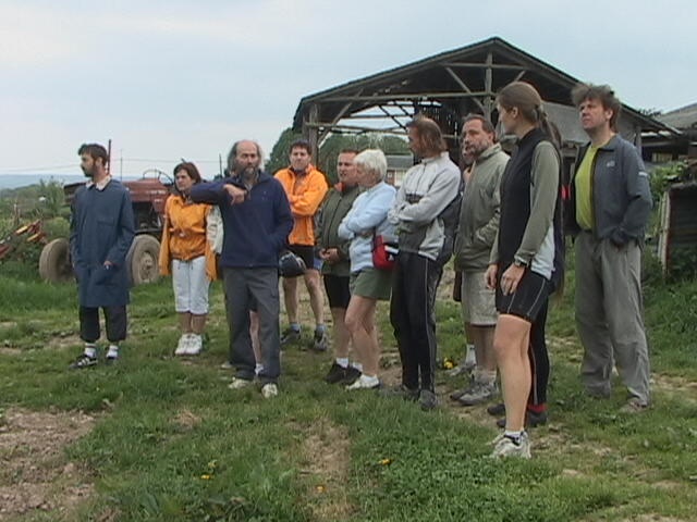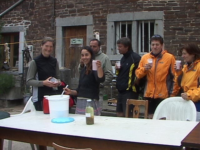 Ce matin, un petit air frais plâne sur le Blanc Gravier. Miette, Mymy et Valentino sont arrivés, la vareuse ou le coupe-vent bien ajusté pour leur première parmi nous. Marc, en culotte courte, est plutôt bien acclimaté. Rien ne le décourage, même pas Jean-Marc qui se voit déjà mourir de froid au détour d'un chemin! Oui mais lequel? Soudain, les pneus quittent le bitume pour la terre bien damée du Bois de la Vecquée. Pendant ce temps, le groupe des vététistes entame tant bien que mal la montée par les petits sentiers du Sart-Tilman. Et Marie-Jo passe en tête... Tours et détours, à gauche puis à droite, on comprend mieux ce que signifie zig-zag. Qui s'en plaindra? Une allée boisée, un Ravel, une route en descente vers la Roche-aux-Faucons... Etourdi par tant de zig-zags, Eduardo en oubliera même d'admirer le point-de-vue. Et qui dit descente, dit montée. Déjà, les vététistes nous rattrapent... Nous voici réunis dans la cour de la ferme Larock où le doux parfum du muguet nous invite à la table de Louis. Boissons aux jeunes pousses de sapin, soupe aux herbes, fromages, visite approfondie de la ferme et partage total d'une philosophie... La récompense est sans pareille pour une journée bio-dynamique!