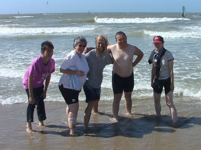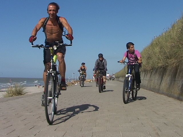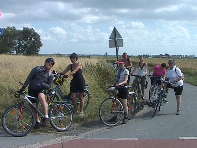 Un petit air de vacances plâne sur le devant de la gare des Guillemins où tous les participants nous attendent de pied ferme pour prendre le train illico presto. Changement de destination: nous partirons de La Panne et non d'Ostende, histoire de vent dans le dos... A la mer, à peine les vélos débarqués de la remorque, le ton est déjà donné: Christophe, 13 ans, me double, queue de poisson, coup de frein... Aïe, ça va être rock'n roll. Arrivés sur la digue, les gros nuages gris donnent au ciel des allures de tableau ténébreux. Un petit tour sur la plage à marée basse et c'est le moment de tous se réunir pour La moule-frites tant attendue... Regardes la goulue, toujours la même... C'est le ventre rempli que nos 7 participants démarrent enfin, tous très motivés, pour un petit tour du côté de Furnes, ses moulins, ses petits chemins zigzaguant. Et la région des polders nous enchantent déjà. Il y a Isa Boum Boum, la plus fidèle, déjà présente pour la première balade, qui file sur le plat "sans tomber"; Eric qui adore piquer son sprint en solo; Titi, notre fofolle ardennaise "aux dents de sorcière"; Valérie, habituée aux grands raids Roule ta bosse; Marie-Jo et Jean-Marc, fidèles cyclistes en préparation d'un voyage vélo; et Chris, le petit filleul, bien épuisé par son entraînement condruzien de 70 bornes de la veille. Après 40 kilomètres de boucles vers les campagnes et un beau canal zigzags moutons, nous rejoignons l'Yser avec, juste plus loin, la digue de Nieuwport... et sa tortue dorée géante. Le lendemain, après une nuit un peu agitée à l'auberge d'Ostdunkerke, le ciel menace de nous tomber sur la tête... mais les éoliennes au pied desquelles nous passons auront tôt fait de chasser ce petit crachin insignifiant. Alors que nous entrons dans les campagnes après cette longue digue de Middelkerke, soudain, c'est le grand ciel bleu jusqu'en fin de journée. Si bien que Jean-Marc nous expose son beau bronzage et que Marie-Jo en pique une tête dans les vagues turbulentes de Bredene. Tout le monde est au top, même Titi qui brave le vent sous les riches applaudissements du peloton. Groupe exceptionnel clinquant au soleil. Merci à tous pour ce week-end réussi!