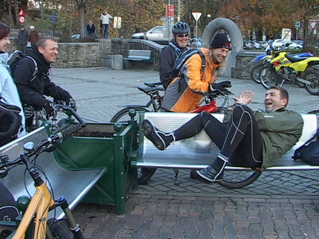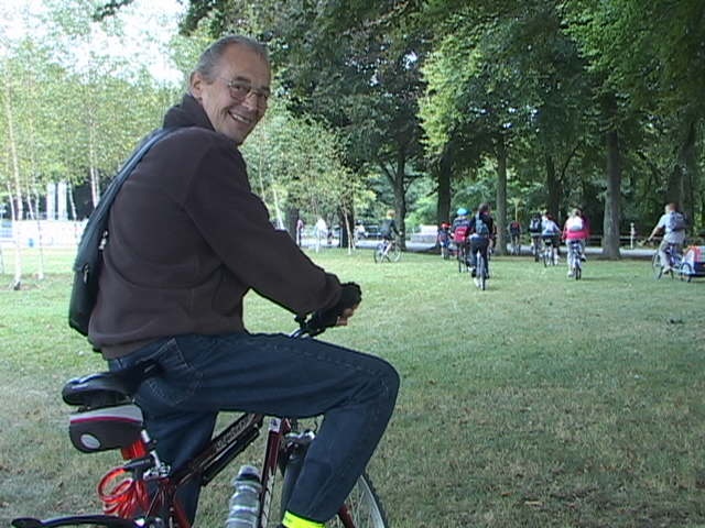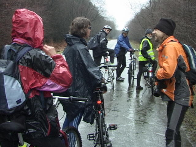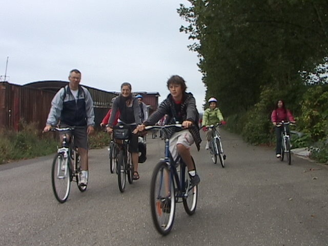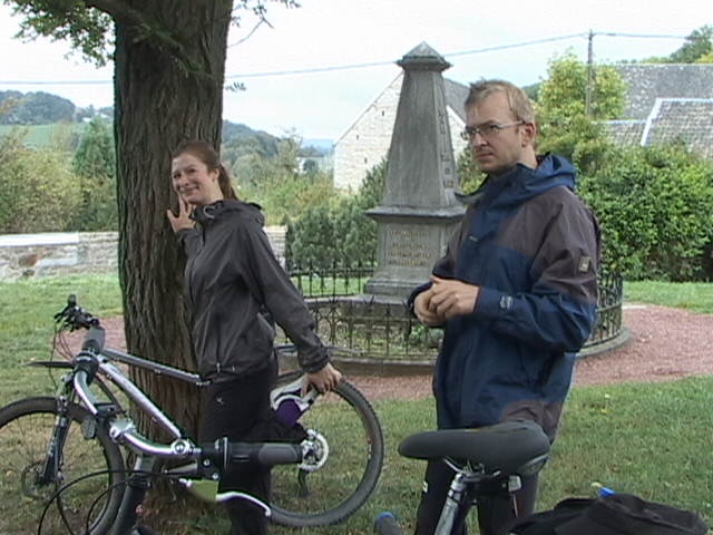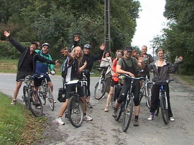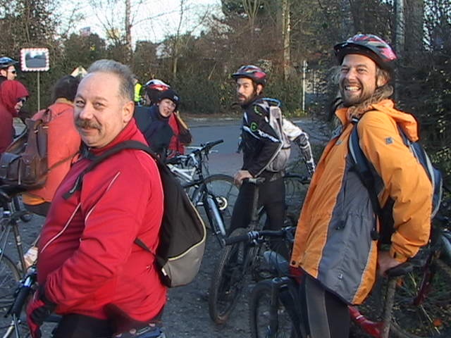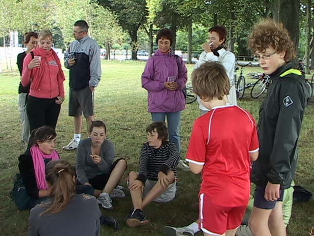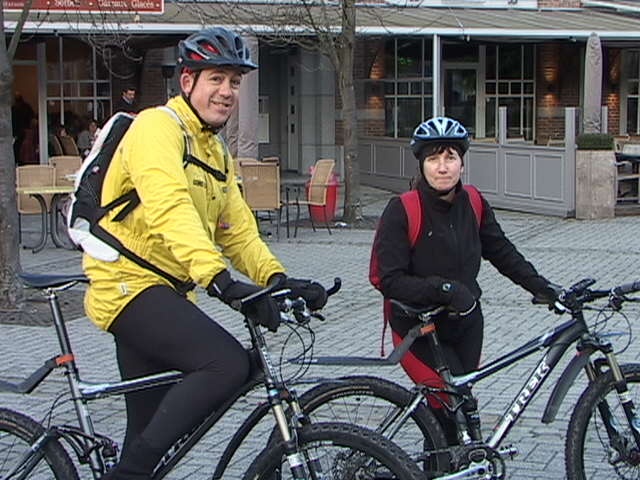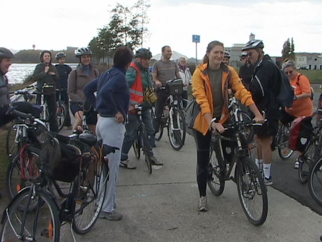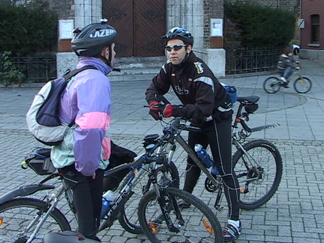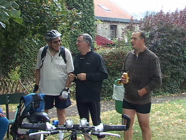 Malgré la "cata" climatique annoncée, au départ du Blanc Gravier, le ciel est bleu clinquant et l'équipe des 15 cyclos est fin prête pour les côtes du Condroz. Parc de la Boverie, nos cinq fidèles vététistes me paraissent motivés pour le même combat...